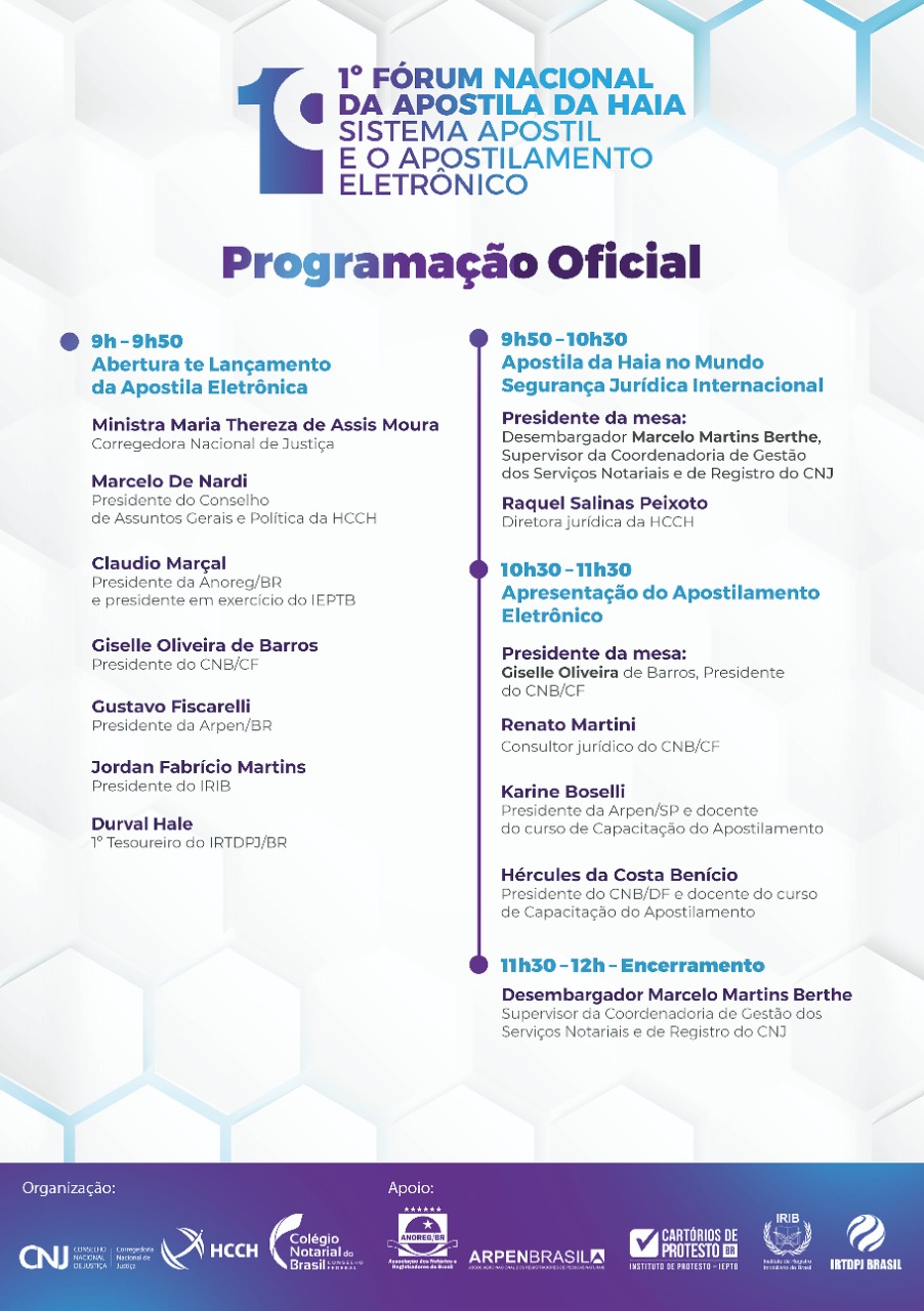 O Conselho Nacional de Justiça (CNJ) convida profissionais notariais, registrais e tradutores juramentados de todo o Brasil para o 1º Fórum Nacional da Apostila da Haia, que ocorrerá dia 3 de junho, às 9h (horário de Brasília). O evento será transmitido ao vivo, diretamente do Plenário do CNJ, pelos canais do YouTube do CNJ e do CNB/CF. A programação conta com o debate acerca do cenário atual, nacional e interncional, da Apostila de Haia e o lançamento oficial da Apostila Eletrônica.